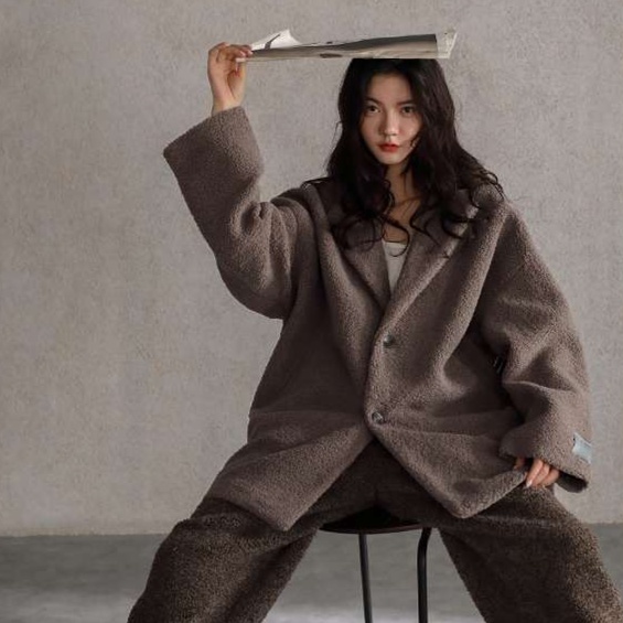 ふわふわのモコモコ素材と上品な襟のコンビネーションが、洗練された印象を作ります。