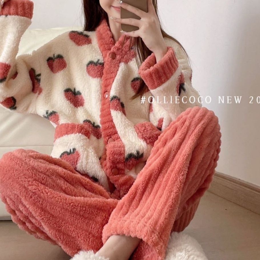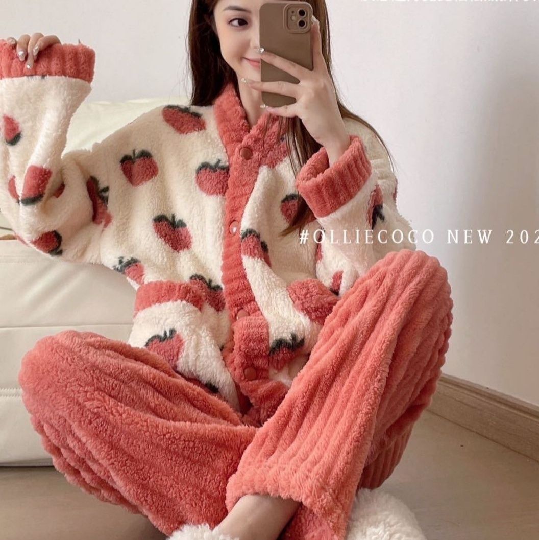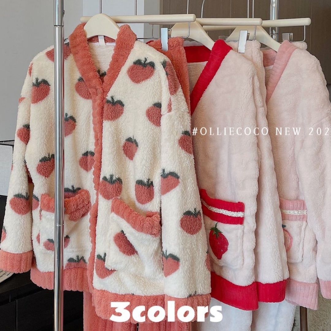 可愛いいちご柄が特徴の冬用裏起毛パジャマです。 ふわふわのサンゴフリース素材で寒い季節も暖かく過ごせます。 3色展開で、おうち時間を快適にするルームウェアとして最適です。