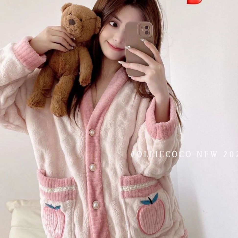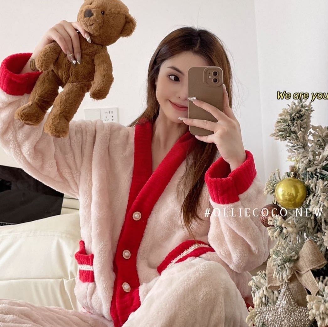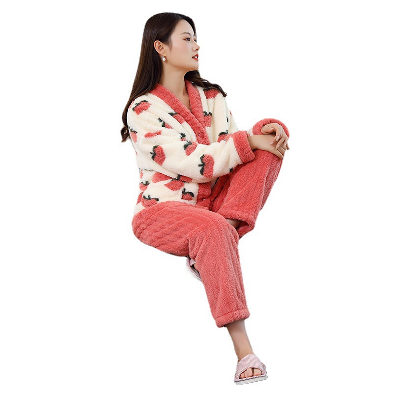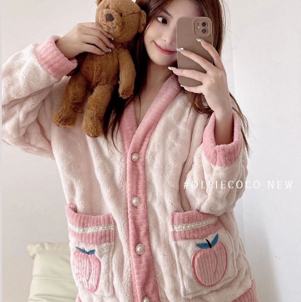 可愛いいちご柄が特徴の冬用裏起毛パジャマです。 ふわふわのサンゴフリース素材で寒い季節も暖かく過ごせます。 3色展開で、おうち時間を快適にするルームウェアとして最適です。