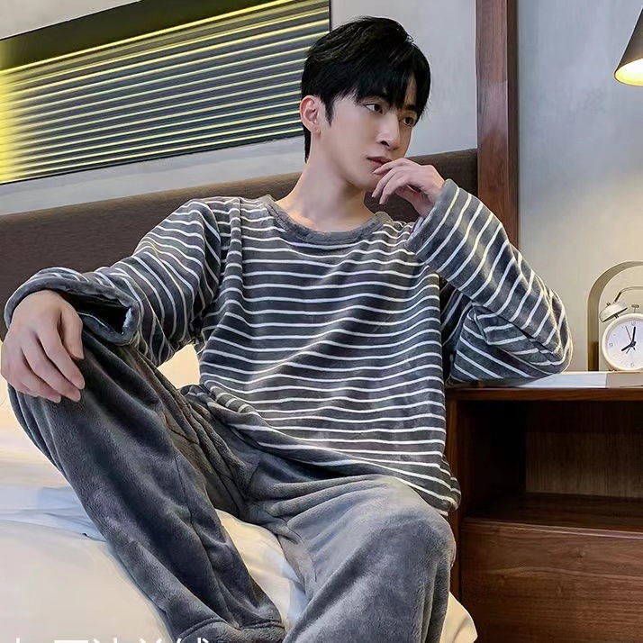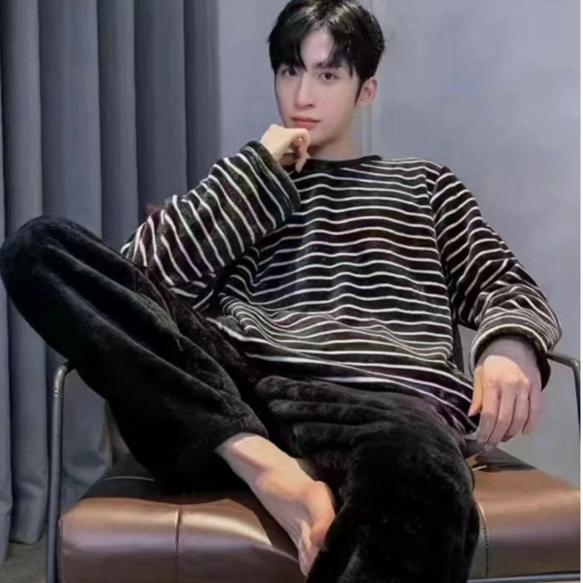 自宅でのくつろぎ時間を快適に過ごせるルームウェアの上下セットです。 上着は細めのボーダー柄で爽やかな印象を与え、ゆったりとした丸首デザインが特徴です。 下はふんわりとした起毛素材のパンツで保温性に優れ、寒い季節も暖かく過ごせます。 柔らかな肌触りと程よいゆとりのあるシルエットで、リラックスタイムに最適な部屋着です。 休日のおうち時間や就寝前のひとときにおすすめの一着です。