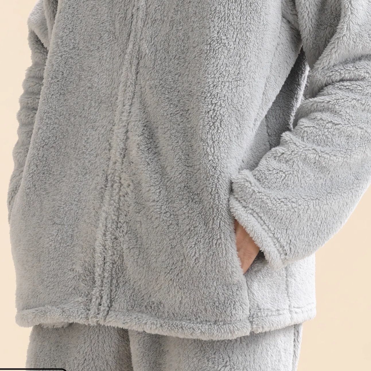ふんわり柔らかなボア素材が心地よい、上下セットのルームウェアです。 ハーフジップデザインで着脱しやすく、首元の温度調節も簡単にできます。 両脇には便利なポケット付きで、スマートフォンや小物の収納に便利です。 ゆったりとしたシルエットで締め付け感がなく、リラックスタイムに最適な部屋着として一日中快適に過ごせます。 寒い季節の自宅時間を暖かく包み込む、保温性に優れた一着です。