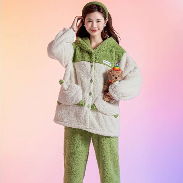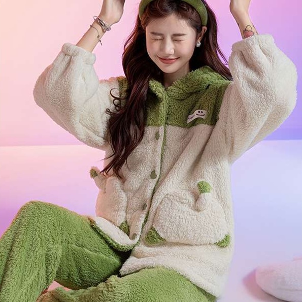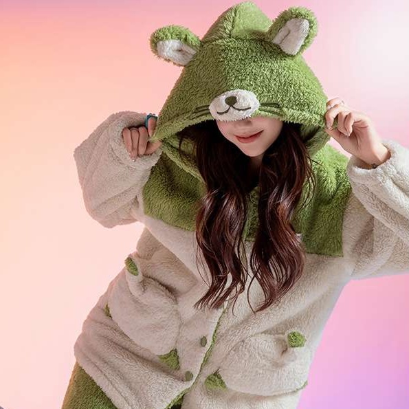 冬の寒さを忘れさせるふわふわ素材のルームウェアセットアップ。フード付きのデザインには可愛らしい動物の耳や顔があしらわれ、着心地と遊び心を演出します。リラックスタイムにぴったりなこのアイテムは、部屋着としてはもちろん、SNS映えも狙えるおしゃれな選択肢。心温まるひとときを提供します。
