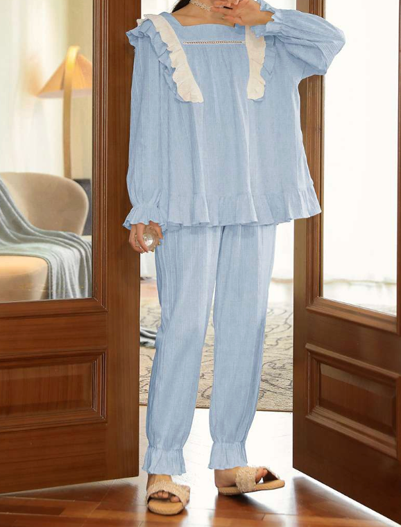セーラーカラーと愛らしいリボンが魅力的なパジャマセット。柔らかな素材が心地よい肌触りを提供し、快適な眠りをサポート。トップスには大きなリボンがアクセントとなり、ルームウェアとしてもおしゃれに決まる。リラックスしたい夜や休日のひとときにぴったりなアイテム。自宅でのくつろぎ時間を一層特別に演出します。