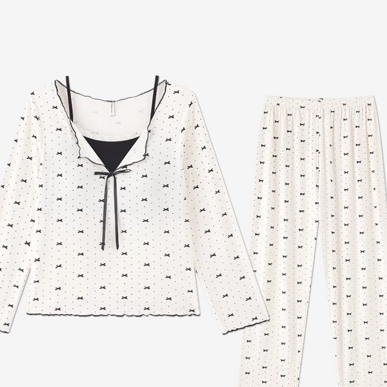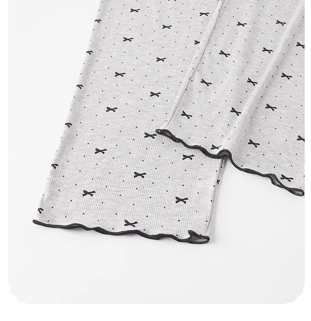 やわらかな綿素材を採用したこのパジャマセットは、リボン模様が全体に散りばめられた愛らしいデザイン。長袖トップスの胸元にはリボンがアクセントとなり、女性らしさを引き立てる。セットのロングパンツと組み合わせることで、快適な睡眠を提供。また、上品なデザインはルームウェアとしても活躍し、リラックスタイムをより特別なものに。自宅でのくつろぎを、スタイリッシュに演出。