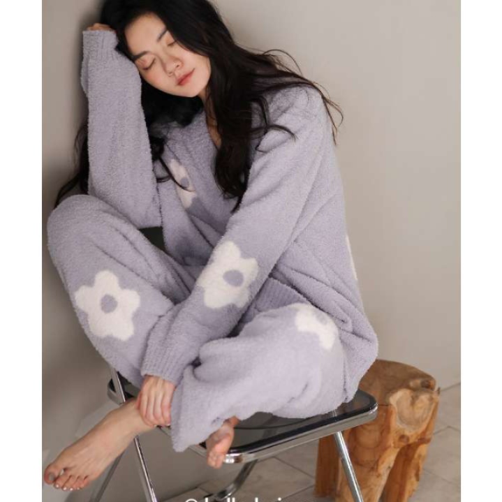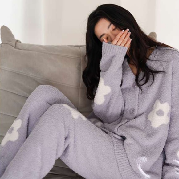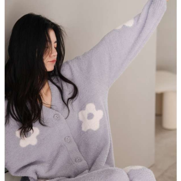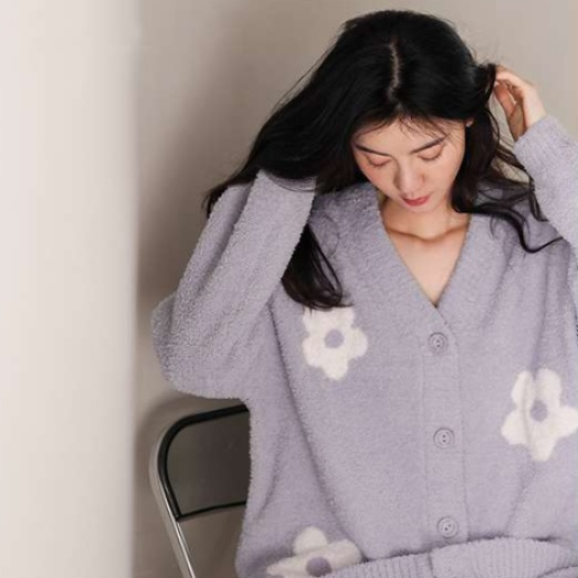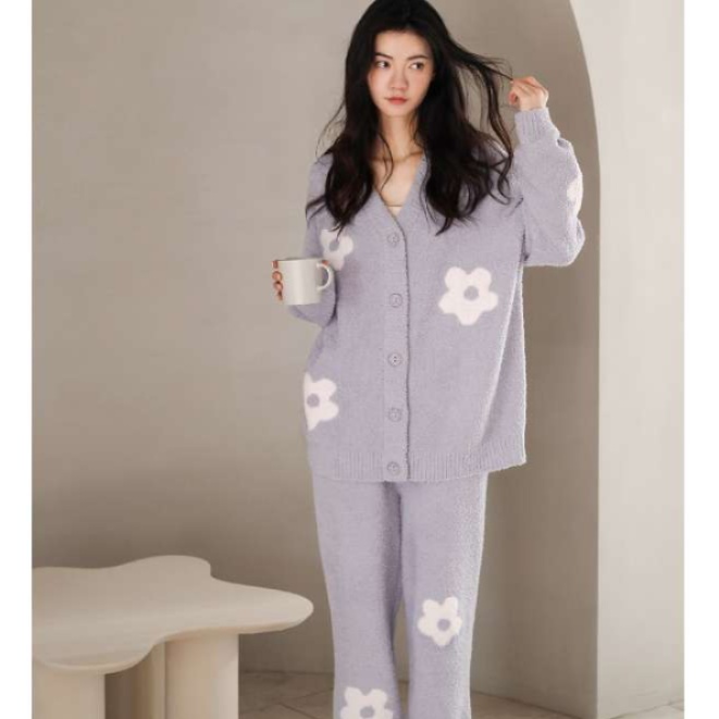 柔らかな肌触りのニット素材を使用したルームウェアセット。かわいい花柄デザインが特徴で、カーディガンとパンツのセットアップスタイル。ゆったりとしたシルエットで快適な着心地を提供します。家でのリラックスタイムにぴったりの一着です。