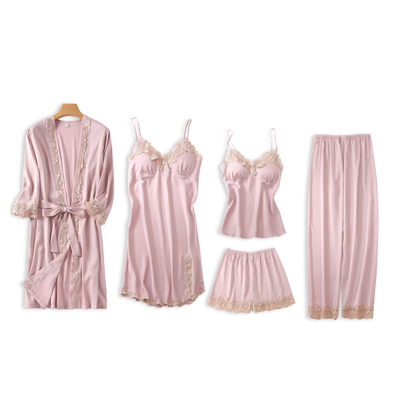 柔らかな生地と美しいレースが際立つ五点セットのルームウェア。寝間着としてはもちろん、日常のリラックスタイムにも最適。シルクのような心地よい肌触りが、優雅さと快適さを提供し、女性らしさを引き立てるアイテム。自宅でのひとときを特別に演出する、魅力的なルームウェアです。