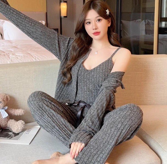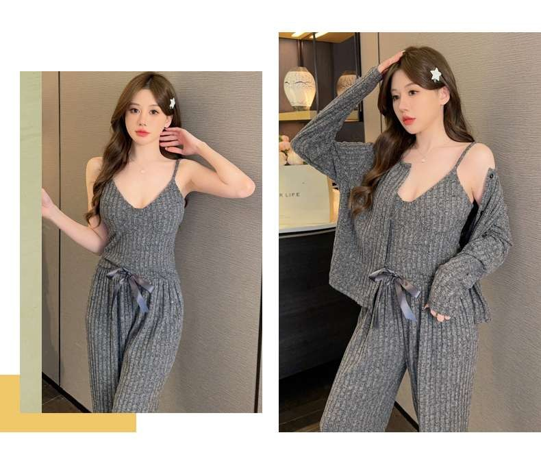 キャミソール、カーディガン、パンツの3点セットで、気温や場面に応じて自由に組み合わせられます。