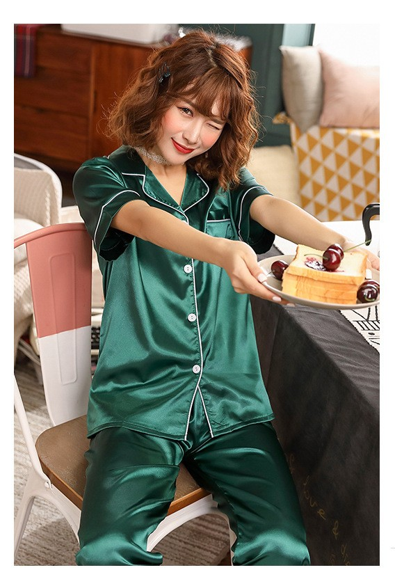 高級感あふれる光沢のあるルームウェアセットアップ。襟元や裾のパイピングが洗練された印象を与え、短めの袖が動きやすさを実現。便利なポケット付きで、機能性も兼ね備えたデザイン。快適な寝心地とスタイリッシュな見た目を両立させた一着で、リラックスタイムをより特別なものに。