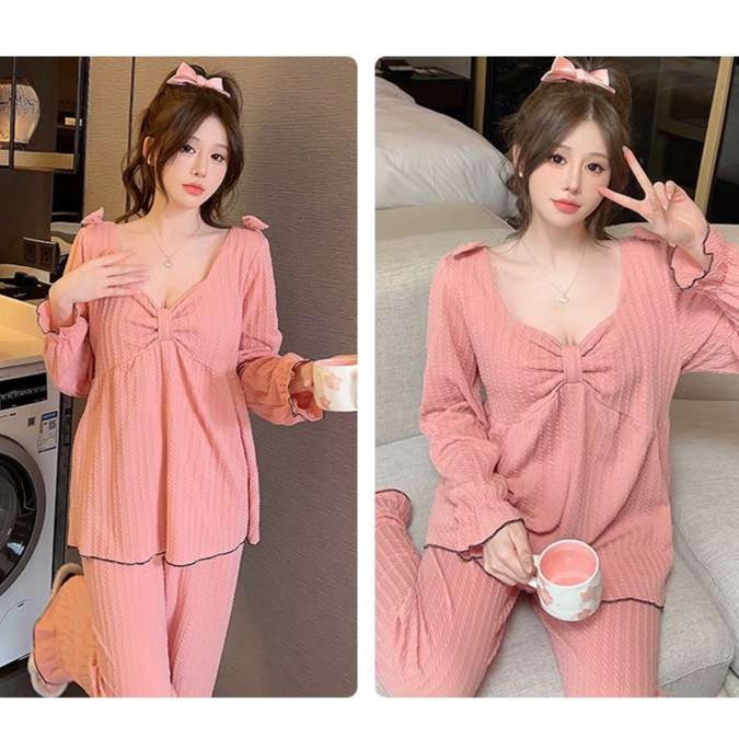 胸元リボンがアクセントの長袖パジャマ◎