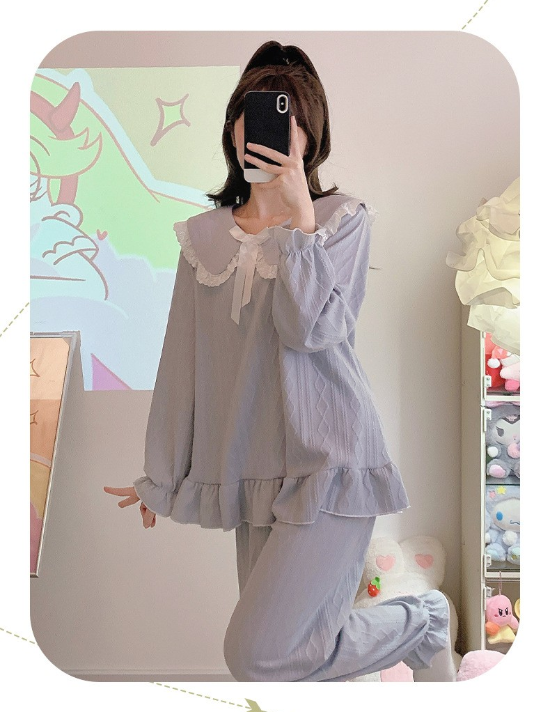 リラックスした時間を演出するルームウェア。特徴的な大きな襟元に施されたフリルデザインが、女性らしさを引き立てます。長袖トップスとワイドパンツの上下セットは、ゆったりとしたシルエットで動きやすさ抜群。柔らかな素材で、寝る時も快適に過ごせる一着。自宅でのくつろぎタイムをより特別なものにしてくれるアイテムです。