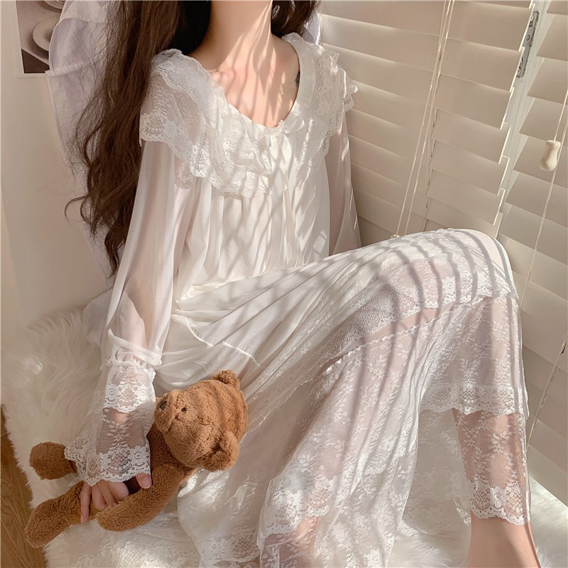 やわらかなレースが施された長袖ワンピースは、透け感のある生地とボリュームのある袖が魅力的です。自宅でのリラックスタイムを華やかに演出し、心地よい着心地が特長。ロマンチックで可愛らしいデザインは、特別なひとときを過ごしたい方にぴったり。ルームウェアとして、優雅な時間をお楽しみください。