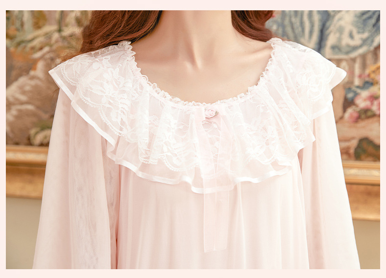 ふんわりとした白色の生地に上品なレースフリルが施された長めのワンピースタイプのルームウェア。七分袖と繊細な首元のフリルが、優雅な雰囲気を演出します。裾のティアードデザインが動くたびに柔らかく揺れ、リラックスタイムを特別に。気品あふれるこのナイトドレスは、心地よい眠りをサポートしながら、自宅でのくつろぎのひとときを演出します。