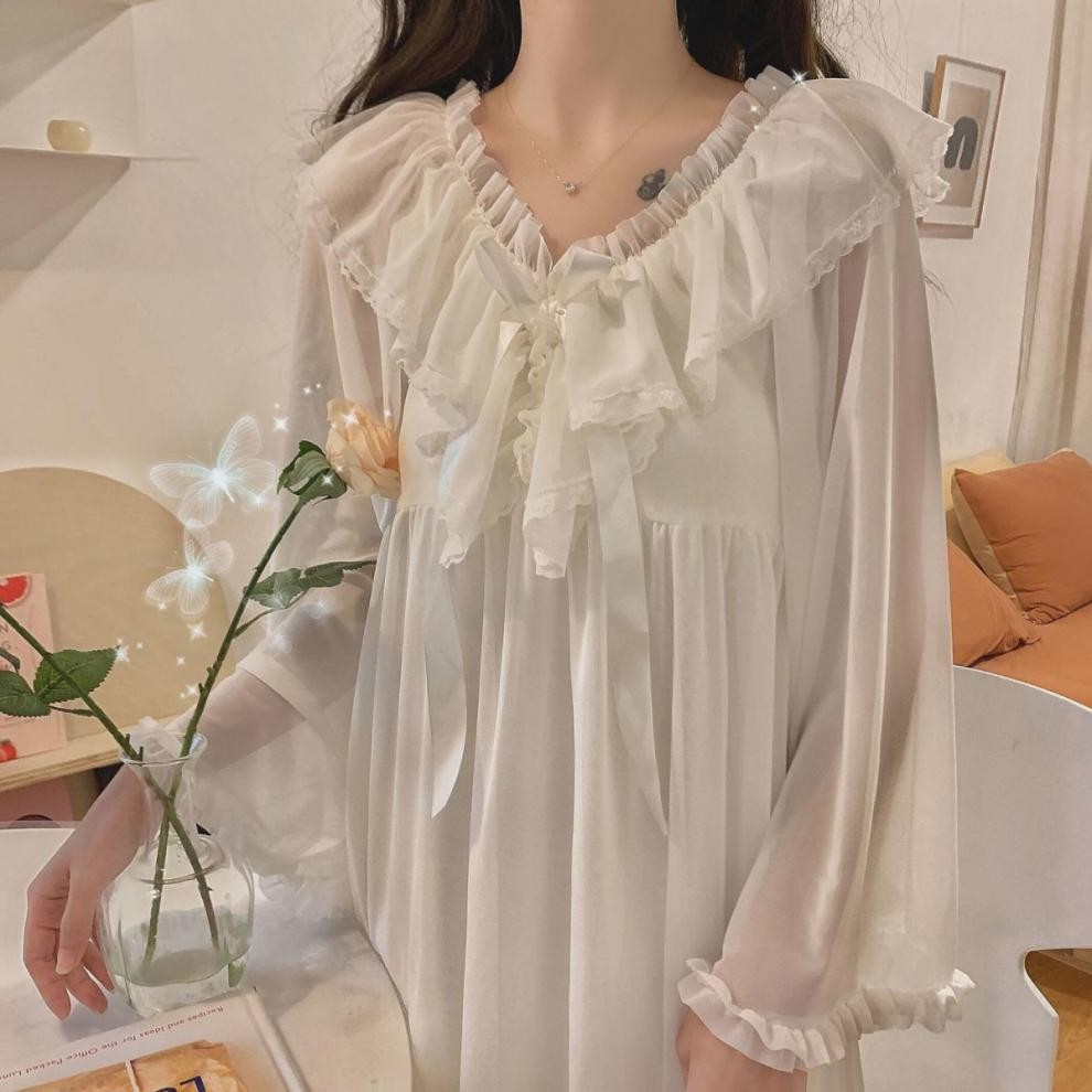透け感のあるふんわりとした生地に、繊細なレースとフリルが施された贅沢なワンピース。胸元のリボンや袖口のレース装飾が上品さを引き立て、リラックスタイムを華やかに彩ります。自宅で過ごす特別なひとときにぴったりなルームウェアです。心地よい着心地と美しいデザインで、くつろぎながらもスタイルを楽しむことができます。