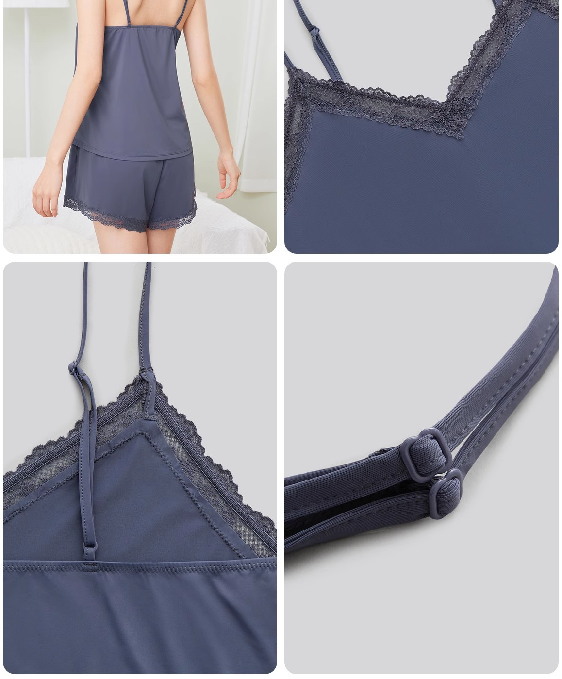 軽やかなシフォン素材を使用したキャミソールとショートパンツのセット。繊細なレースが女性らしさを引き立て、心地よい肌触りが快適な眠りへと導く。暑い夏の夜に最適な爽やかなネグリジェで、リラックスしたひとときを楽しむことができる。自宅でのくつろぎ時間をより特別なものにするアイテム。