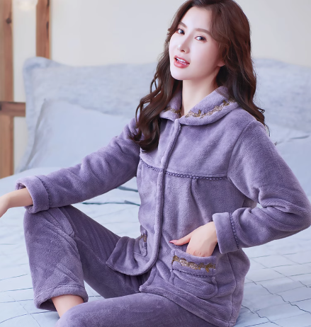 やわらかな肌触りの起毛素材を使用した女性向けパジャマセット。前開きタイプで着脱しやすく、ゆったりとしたシルエットで快適な睡眠をサポート。胸元の刺繍がかわいいアクセントに。部屋着としても活躍する暖かなルームウェアです。
