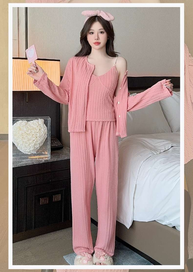 キャミソール、カーディガン、パンツの3点セットで、気分や場面に合わせて自由な組み合わせを楽しめます。