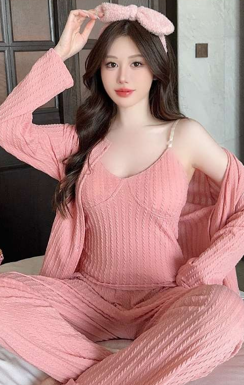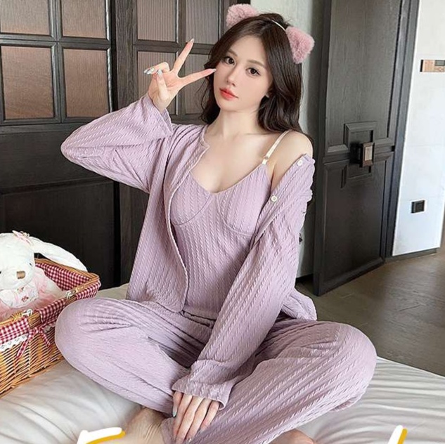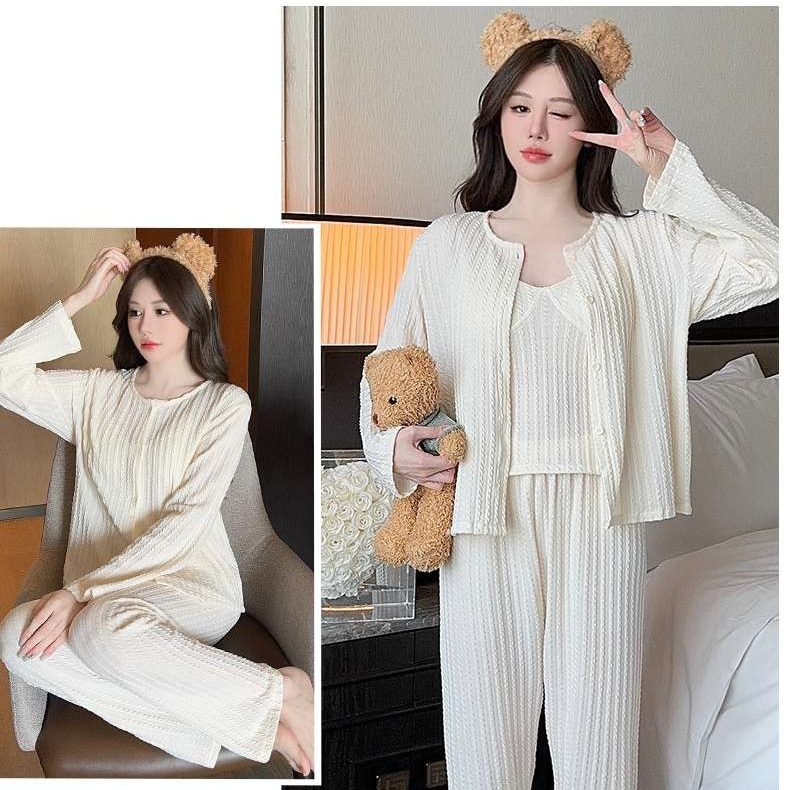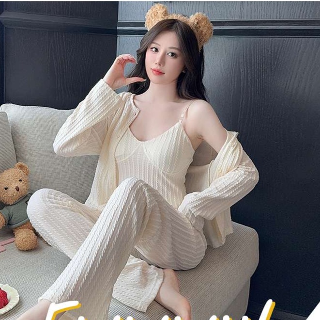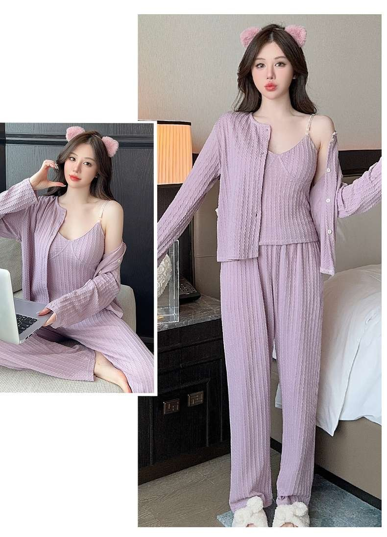 取り外し可能な胸パッド付きキャミソール、長ズボン、羽織りものがセットになった便利な3点セット。柔らかなリブ編み素材が肌に優しく、快適な着心地を実現します。部屋着としてリラックスしながらも、来客時にもしっかり対応できるおしゃれなデザインが魅力的。実用性とスタイルを兼ね備えた一着です。