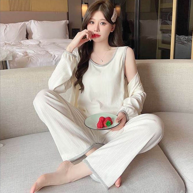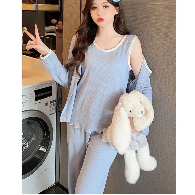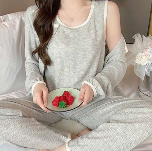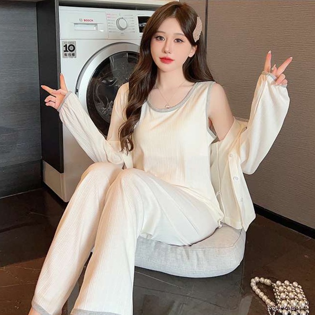 冷房対策にもぴったりの長袖カーディガン、ノースリーブトップス、ロングパンツがセットになったルームウェア。柔らかな素材が肌を優しく包み、ゆったりとしたデザインで快適な着心地を実現します。おしゃれで機能的な部屋着として、リラックスタイムを華やかに演出する一着です。