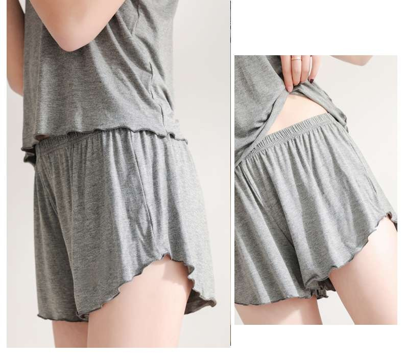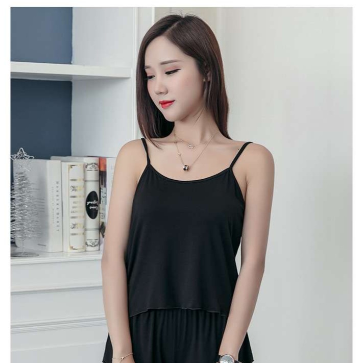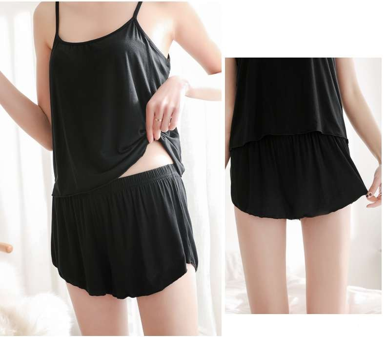 ゆったりとしたキャミソールと短めのパンツで、くつろぎながらもスタイリッシュな印象を与えます。