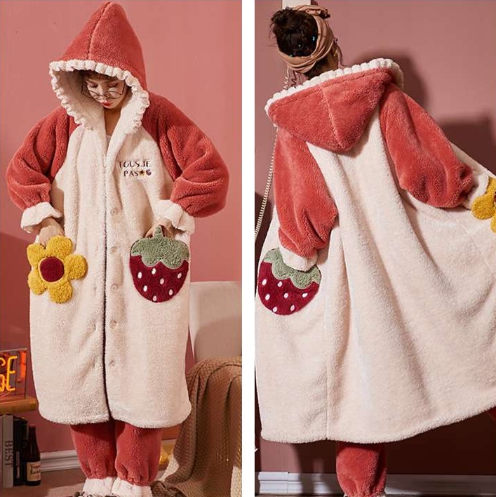柔らかなふわふわ素材が心地よく、暖かさを提供する可愛らしいパジャマ。大きな耳付きフードと胸元のいちごデザインがアクセントとなり、愛らしい雰囲気を演出します。ゆったりとしたシルエットで寝心地も抜群。部屋着としても活躍する、寒い季節にぴったりのルームウェアです。