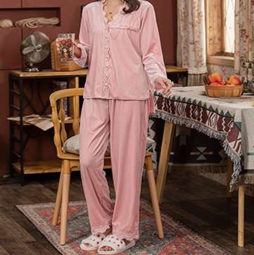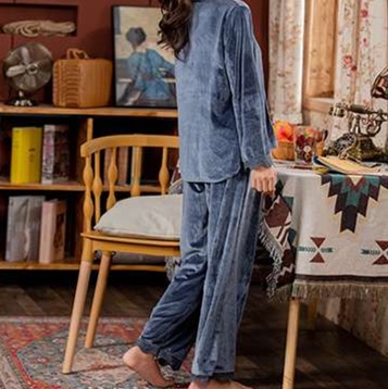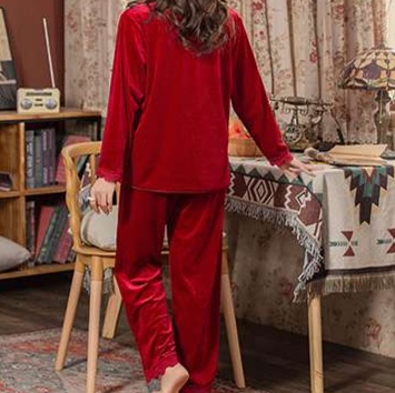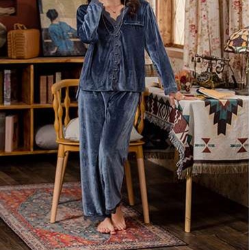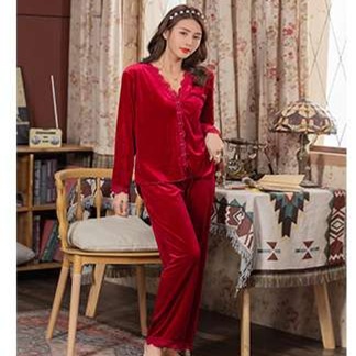 ベルベット調素材とレースを組み合わせたエレガントなルームウェアセットアップ。なめらかな肌触りで、リラックスしたい時や寝間着として最適です。胸元の繊細なレースが洗練された雰囲気を醸し出し、ゆったりしたシルエットが快適な着心地を提供します。特別なひとときを演出する華やかなデザインで、心地よいリラックスタイムをお楽しみください。