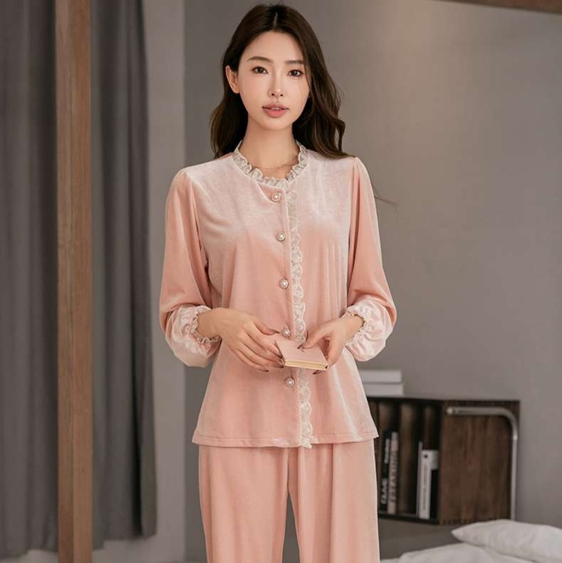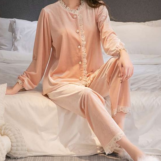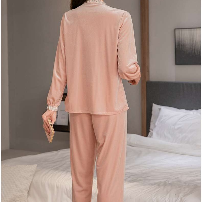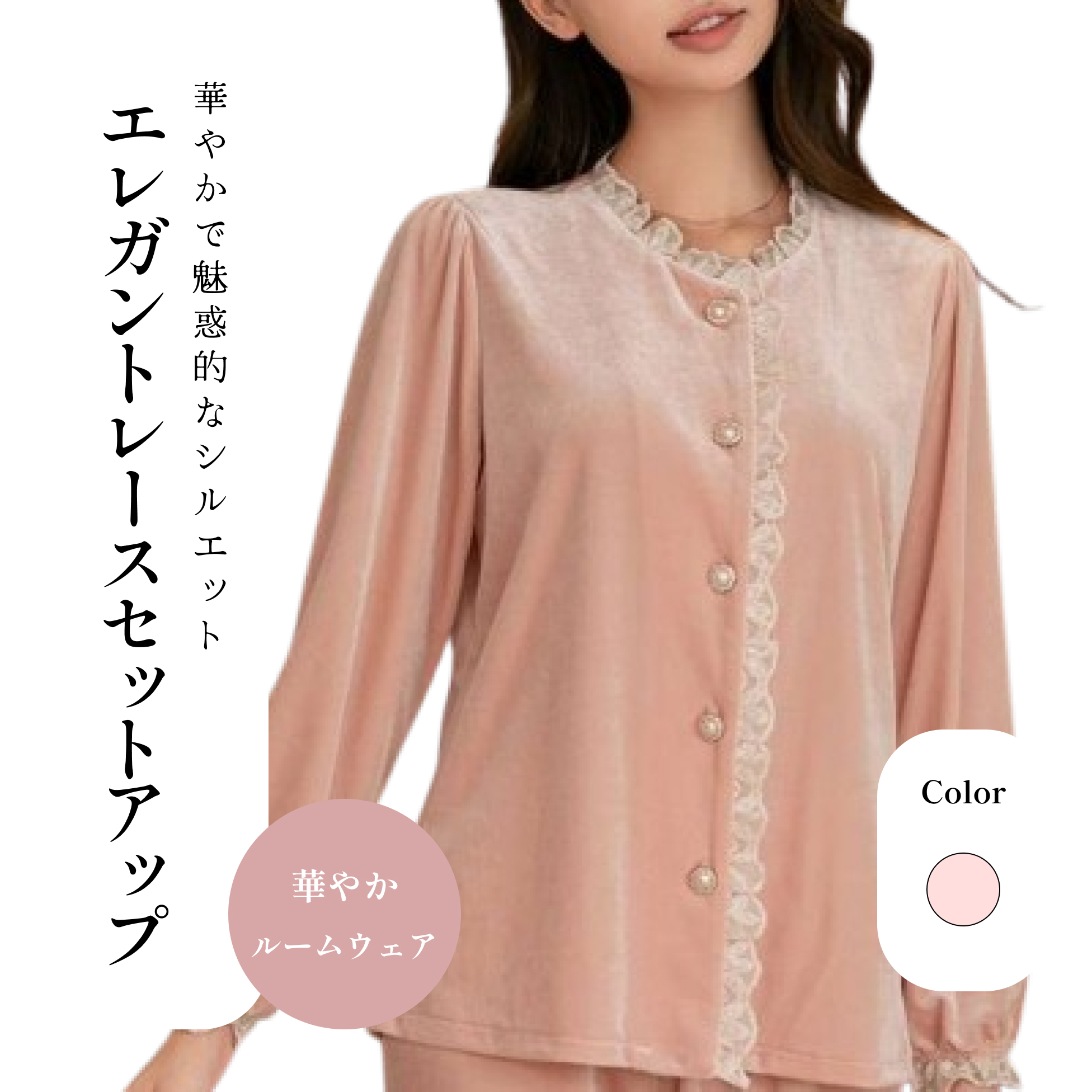 贅沢なシルク調素材と繊細なレースが魅力のエレガントなパジャマ。上品な光沢感が特徴で、スタンドカラーやパールボタンが女性らしさを引き立てます。リラックスタイムをより特別にするためのデザインで、心地よさと優雅さを兼ね備えた一着。自宅でのくつろぎのひとときを、特別な装いで楽しむことができるアイテムです。