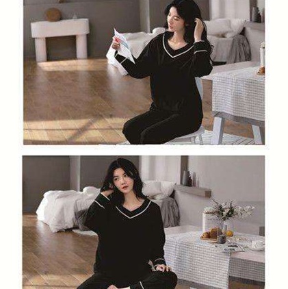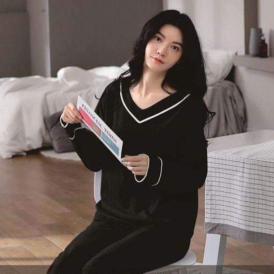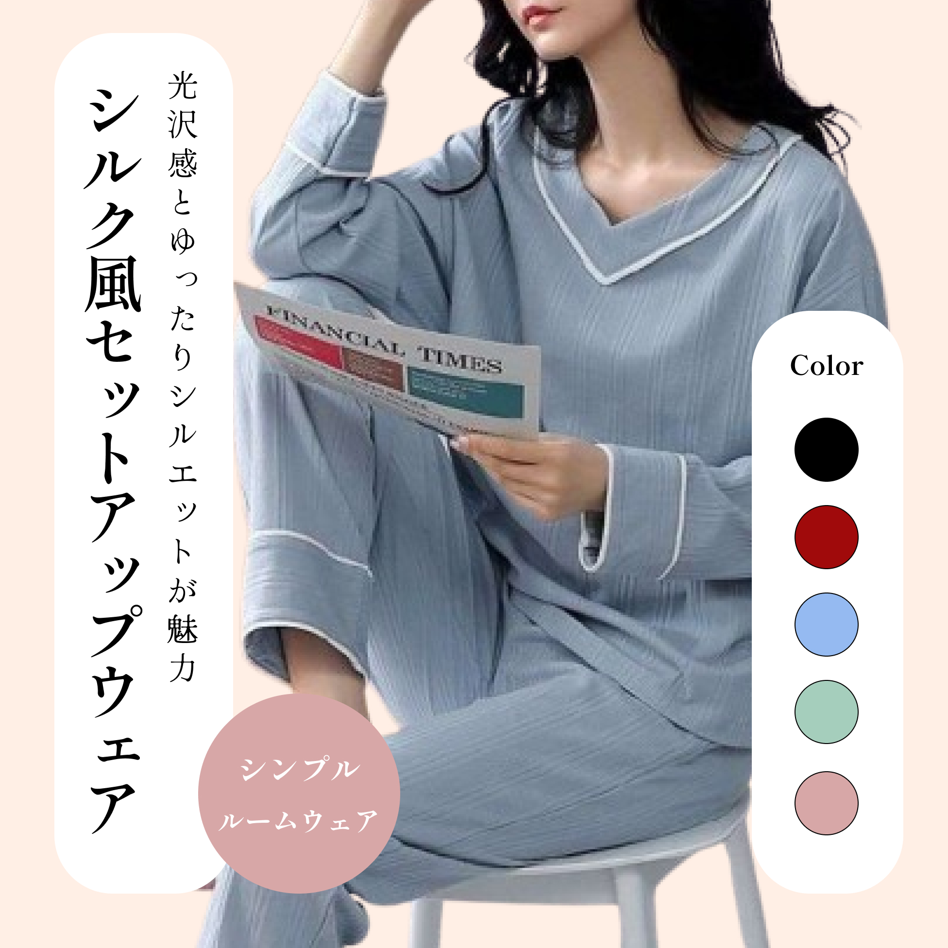 しなやかな光沢感のある生地を使用し、リラックス感と上品さを兼ね備えたルームウェア。フレア袖が女性らしい華やかさをプラスし、ホワイトパイピングがアクセントとなった洗練されたデザインです。部屋着でありながら優雅な雰囲気を醸し出し、おうち時間を特別なひとときに彩るセットアップです。