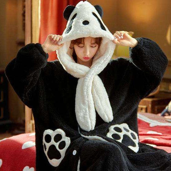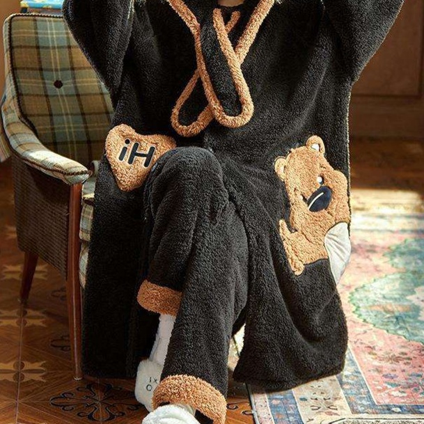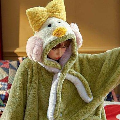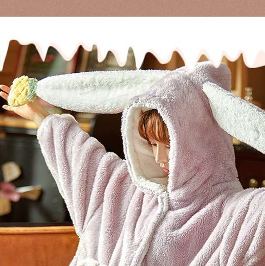ふわふわの肌触りが心地よい、寒い季節にぴったりの着る毛布タイプのガウン。大きな耳付きフードとアップリケが可愛らしいデザインで、リラックスタイムをより楽しく演出します。袖口と裾にはポンポンがあしらわれ、キュートさと暖かさを兼ね備えたルームウェアです。