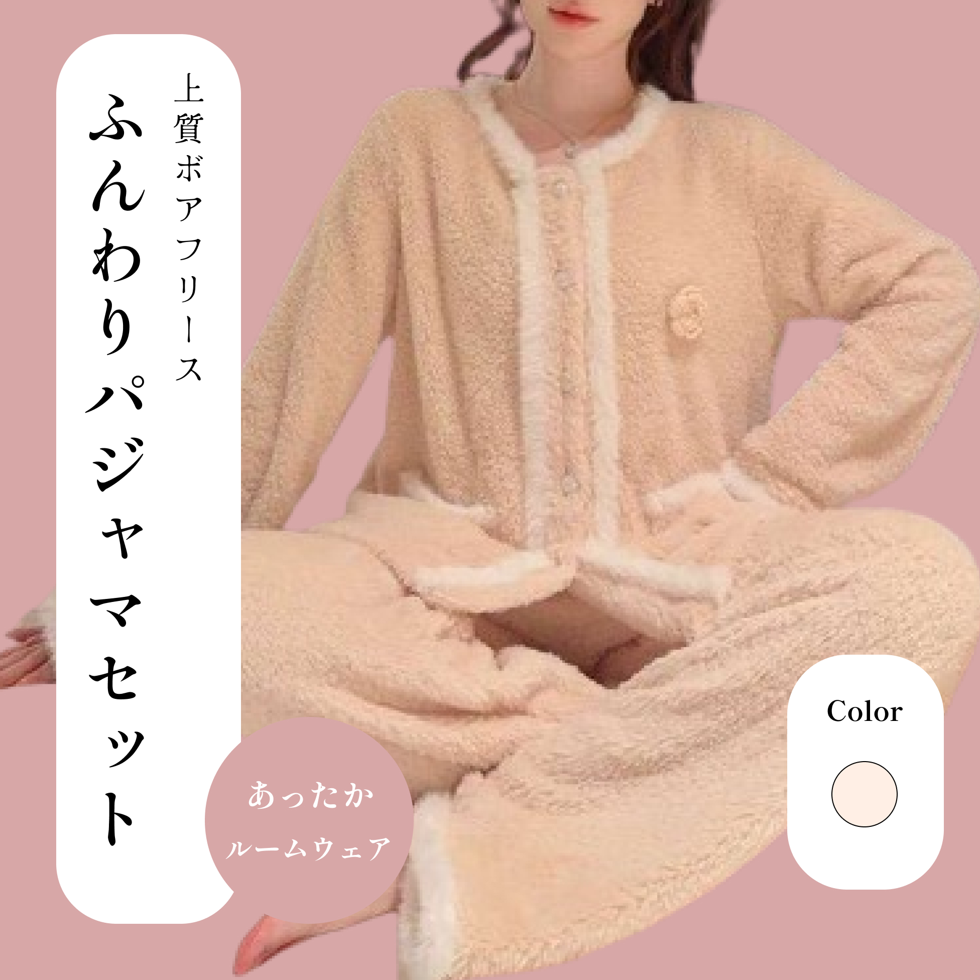 ふんわり柔らかな肌触りの上質なボアフリース素材を使用したルームウェア。胸元のワンポイント刺繍がアクセントに。暖かさと快適さを兼ね備えた上下セットで、部屋着としてはもちろん、ちょっとした外出にも活躍する一着です。