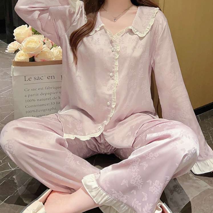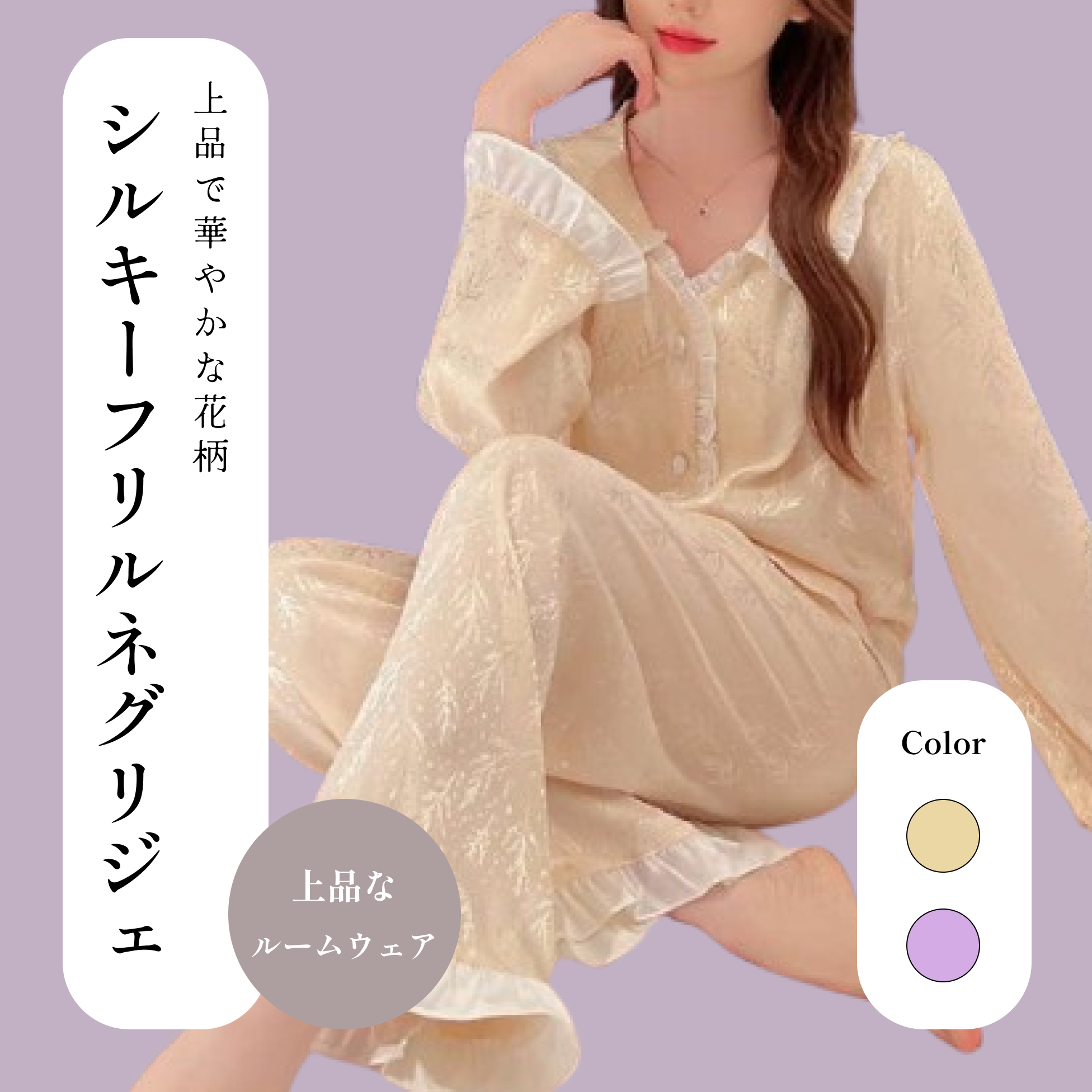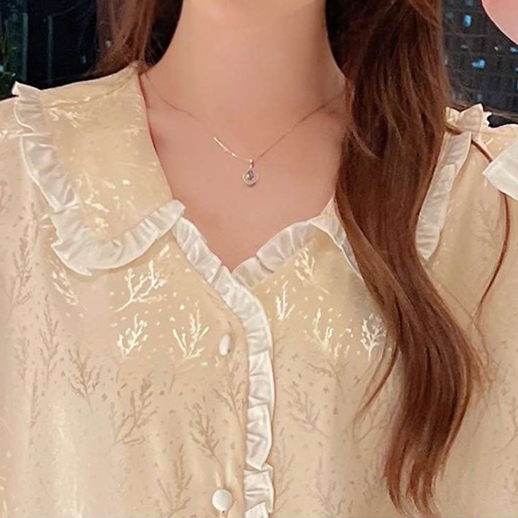襟元のフリルデザインが甘さを加え、女性らしい上品な寝間着スタイルを演出します。