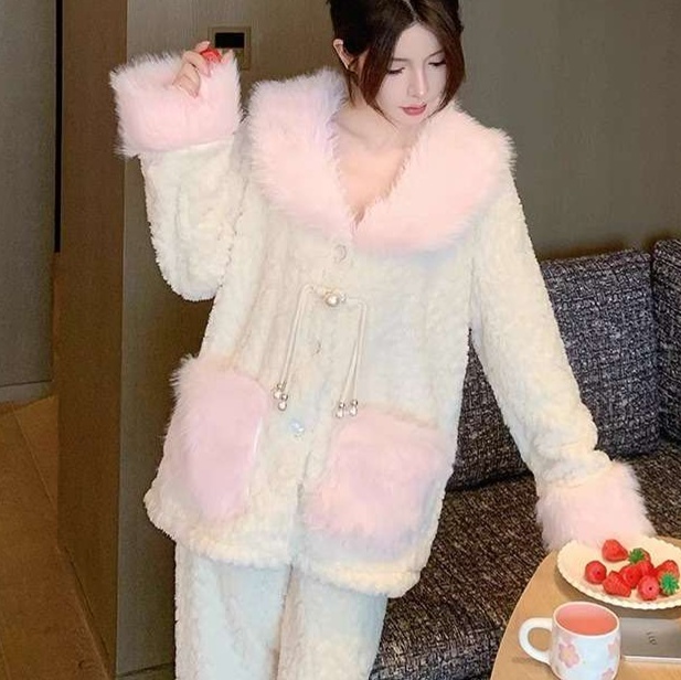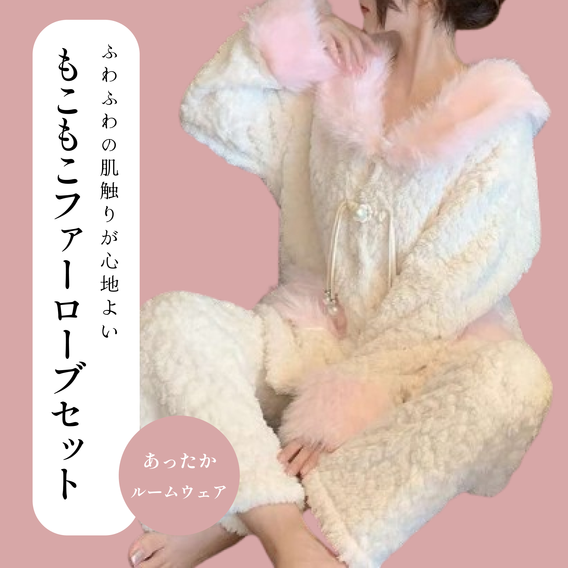 ふわふわで上質な肌触りが特徴のルームウェア。贅沢な毛足の長いファー素材を使用したローブとパンツのセットアップで、リラックス感と高級感を兼ね備えています。パールボタンとリボンが上品なアクセントとなり、部屋着でありながら女性らしさを引き立てるデザイン。おうち時間を華やかに彩る特別な一着です。