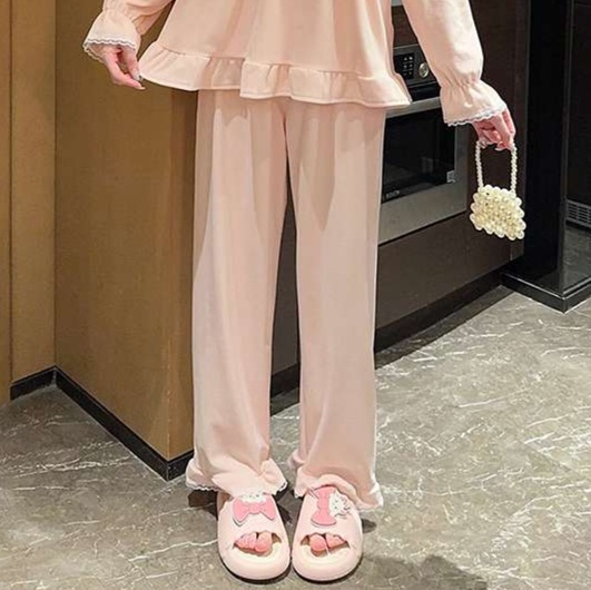 たっぷりのレースと刺繍をあしらった、華やかなバブリー風デザインのパジャマ。バスト部分のリボンとフリル裾がガーリーで愛らしい雰囲気を演出します。裾レースのパンツとセットで、甘さと優雅さを兼ね備えたルームウェアに。おうち時間を特別に彩る一着です。