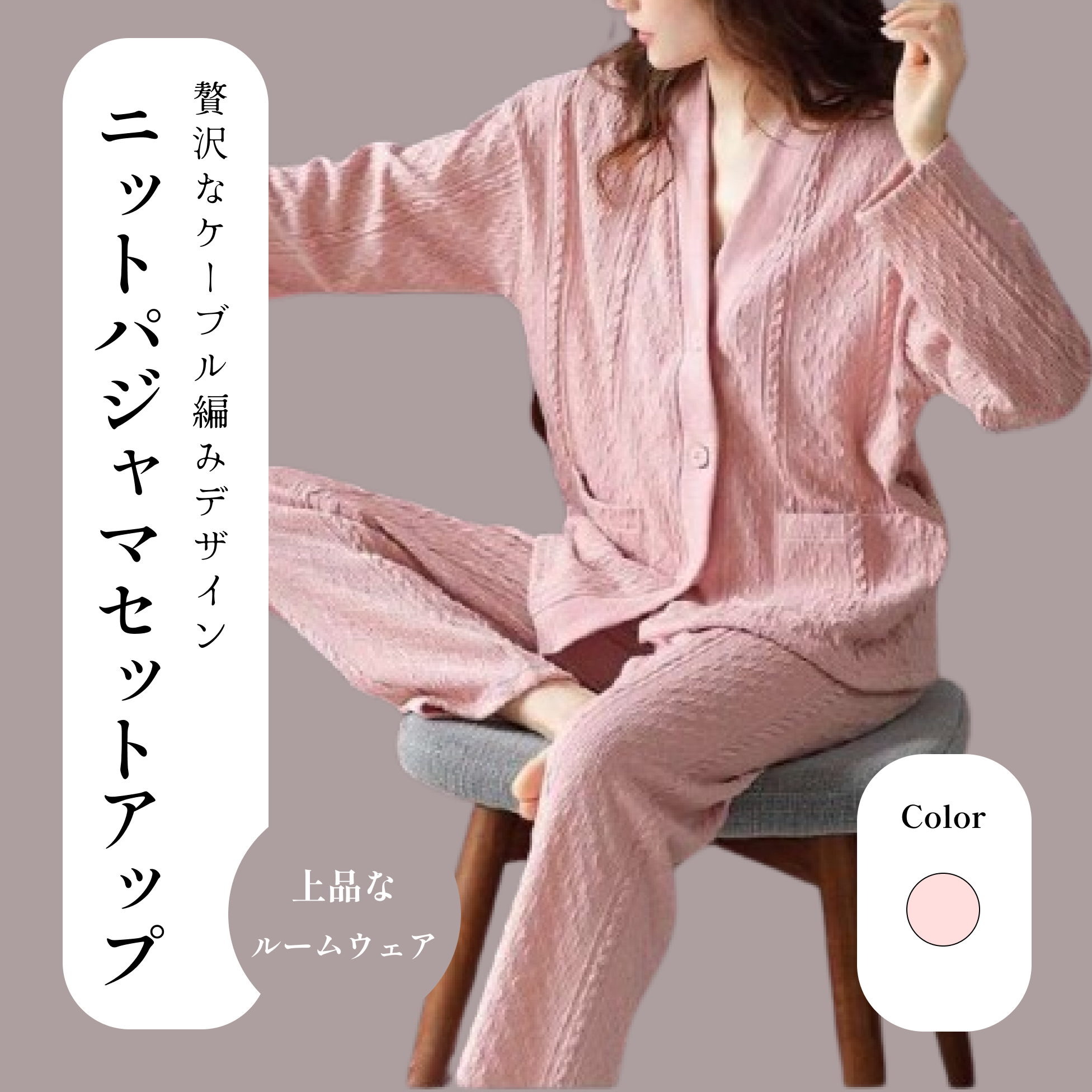 レディースルームウェアのセットアップ。贅沢なケーブル編みが立体感を演出し、上品で洗練された印象に仕上げた一着です。柔らかな素材と快適な着心地で、リラックスタイムをより贅沢に彩ります。部屋着としてはもちろん、カジュアルな外出着としても活躍するデザインです。