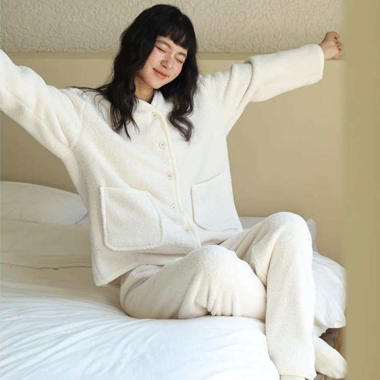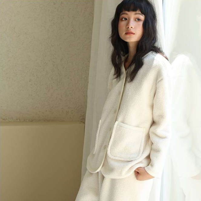 レディースルームウェアのセットアップ。ふんわりと柔らかな肌触りのフリース素材を使用し、寒い季節でも心地よく過ごせる暖かさを実現しました。快適な着心地でリラックスタイムを贅沢に演出する一着です。