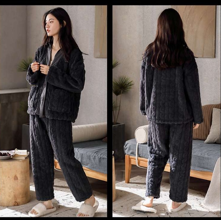 レディースルームウェアのセットアップ。贅沢な肌触りのフリース素材を使用し、心地よい暖かさを提供します。リラックスタイムを快適に過ごせるデザインで、寒い季節にぴったりの一着です。